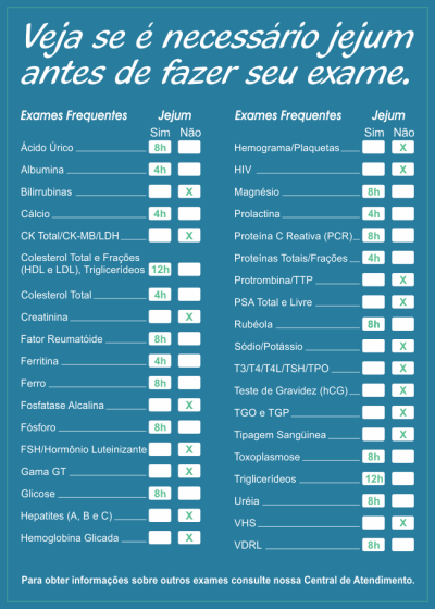 O tempo de jejum depende do tipo de exame solicitado, pode variar de 4 a 12 horas, sendo que alguns não necessitam dessa condição. Há casos em que, além do jejum, uma dieta especial é necessária.