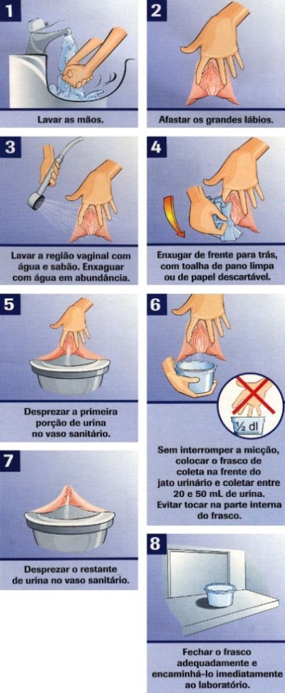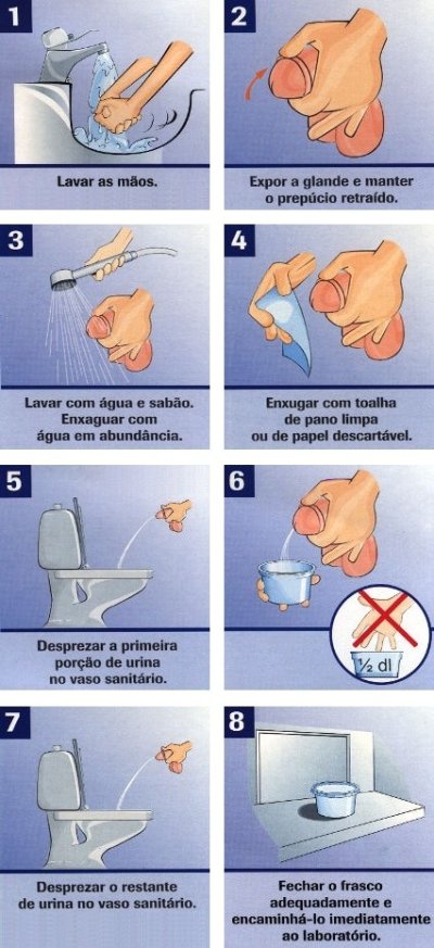 Urina de 1º Jato: Idem ao procedimento acima, porém recolhe-se o primeiro jato e despreza-se o restante.